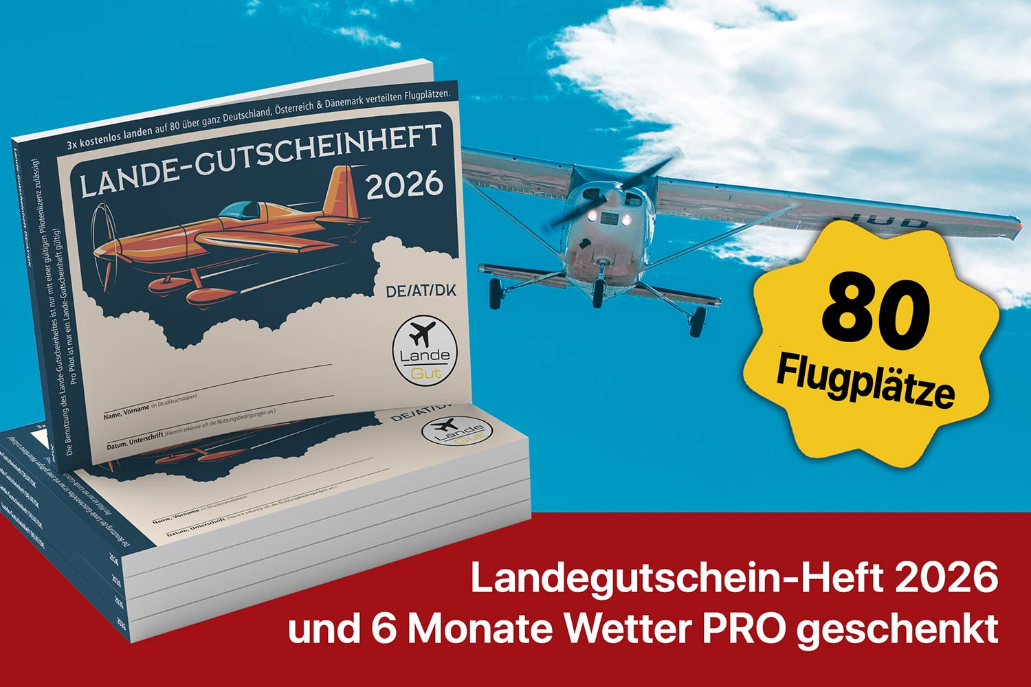 Auch im kommenden Jahr wird durch das Lande-Gutscheinheft 2026 das Fliegen für Dich wieder günstiger. Insgesamt kannst Du mit dem Lande-Gutscheinheft auf 80 Flugplätzen jeweils drei Mal landen ohne die sonst fälligen Landegebühren zahlen zu müssen. Da macht sich das Lande-Gutscheinheft schon nach wenigen Landungen bezahlt!