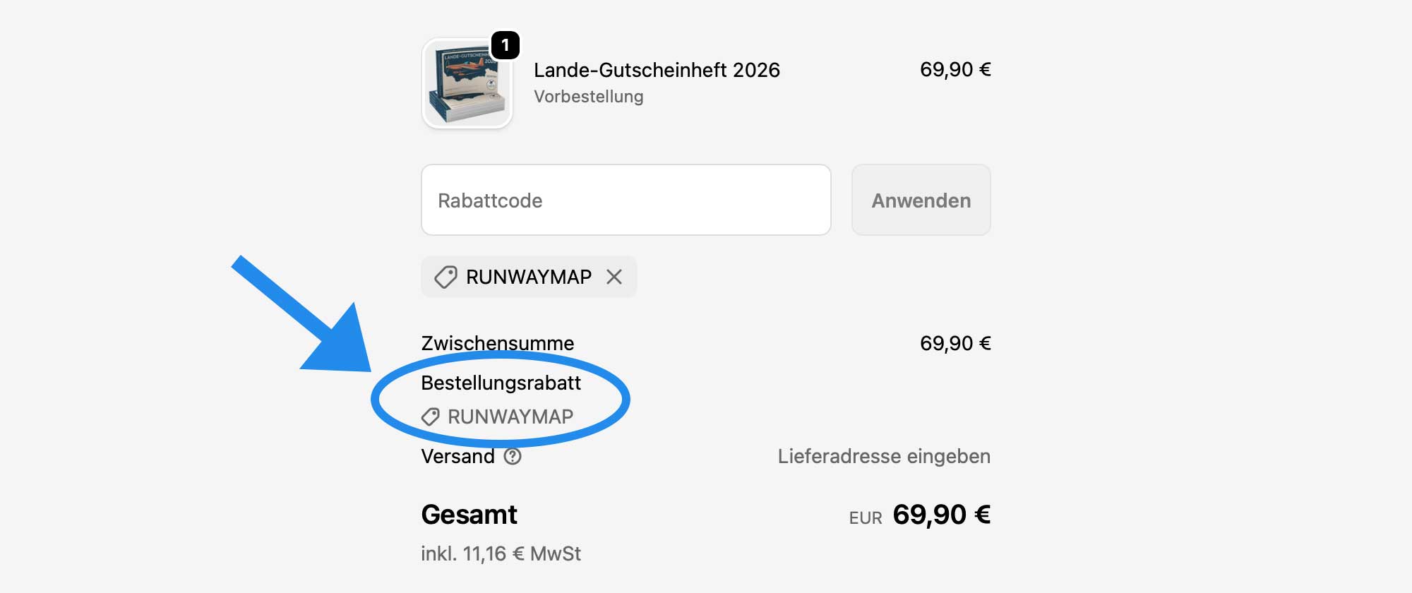 Wichtige Hinweise: Neu ist die Damke LandeGut GbR Herausgeberin des Lande-Gutscheinheftes. Christian Damke und sein Cousin Jasper Damke haben von AirShampoo das seit 21 Jahren bestehende Landegutschein-Heft übernommen und führen es weiter. Alle Detailinformationen, Konditionen sowie die AGB zum Lande-Gutscheinheft findest Du auf der LandeGut GbR Webseite. Das Angebot ist gültig bis zum 9. November 2025. Die Gratis Monate Wetter PRO können nicht auf ein bestehendes Wetter PRO Abo angerechnet werden. Keine Barauszahlung. Das Wetter PRO Abo in RunwayMap startet unmittelbar ab positiver Prüfung durch RunwayMap und endet spätestens am 30. Juni 2026. Der Rechtsweg ist ausgeschlossen. Änderungen sind vorbehalten. Der Link zur LandeGut GbR Webseite ist ein Affiliate-Link. Das heisst, wir bekommen eine kleine Provision, wenn Du beim Herausgeber das Landegutschein-Heft kaufst. Der Preis für Euch ändert sich natürlich nicht. Damit unterstützt Ihr unsere App und unsere Arbeit!